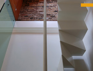 O branco absoluto é quebrado pela luz que bate no vidro, colorindo de leve o espaço. A escada é feita de chapa metálica dobrada. Olhem que desenho incrível. Muito leve... Parece uma dobradura de papel; uma escultura.
